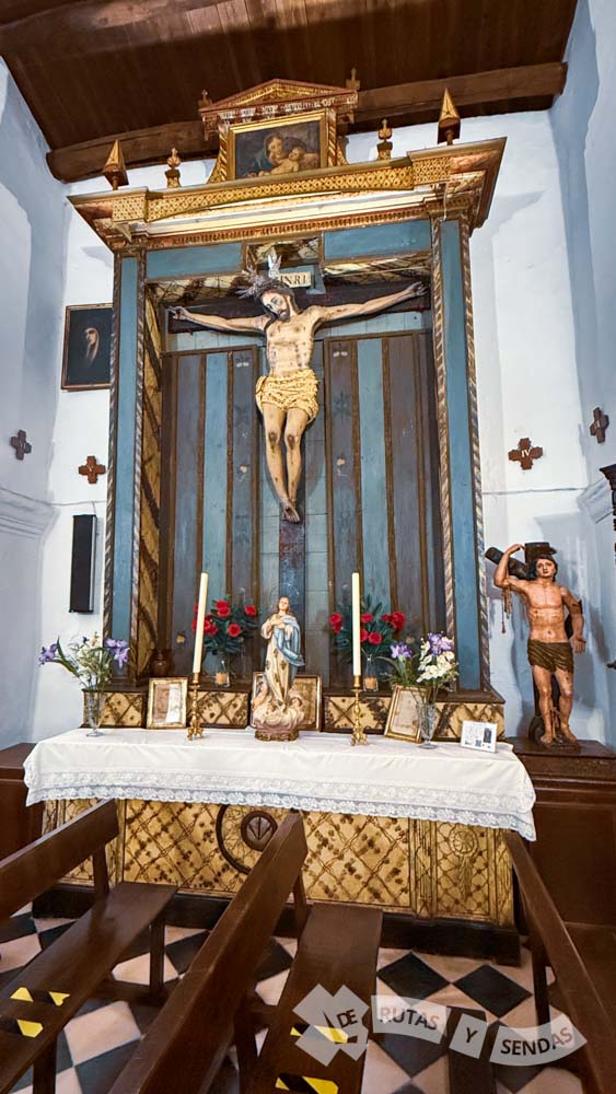 Para terminar la visita en el templo reparamos en el Cristo crucificado hecho a base de papel. Este material le confiere un peso muy ligero, permitiendo ser portado por el sacerdote en el Vía Crucis.