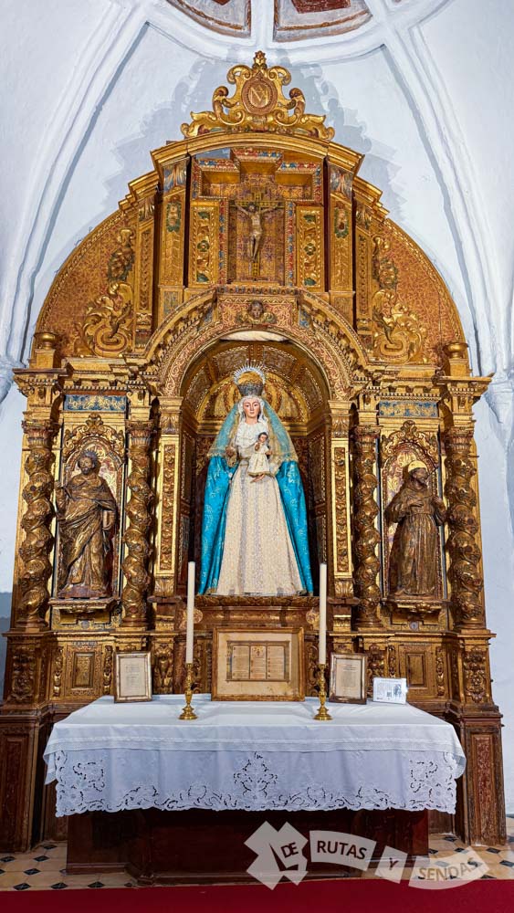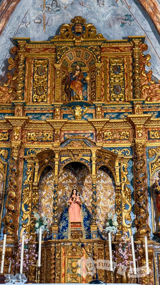 El presbiterio está presidido por un retablo barroco construido en el año 1.701. En su cuerpo central las imágenes de San Pedro y San Pablo se sitúan a los lados de la talla de Nuestra Señora de la Cabeza, cuyo cabello es natural. No en vano, esta iglesia también recibe el nombre de esta patrona.