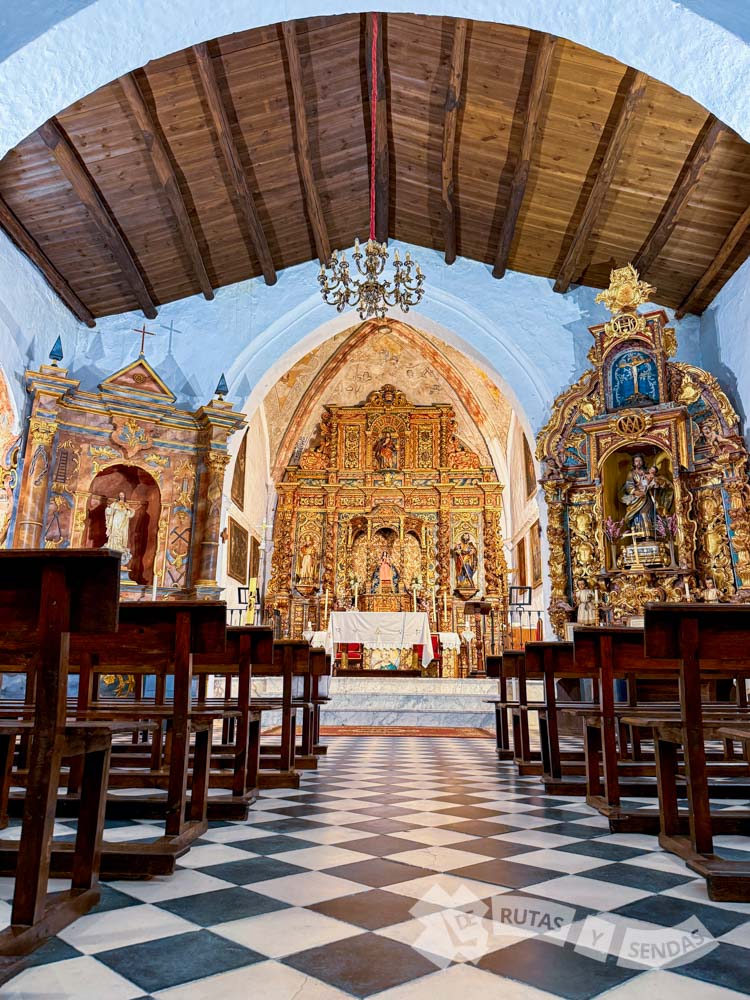 Accediendo al interior del complejo advertimos una planta rectangular con una sola nave. La cubierta se compone de un armazón de madera salvo el presbiterio, confeccionado por una bóveda de crucería.