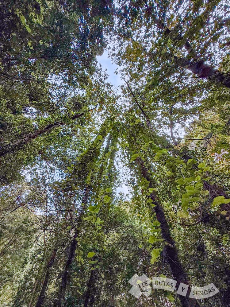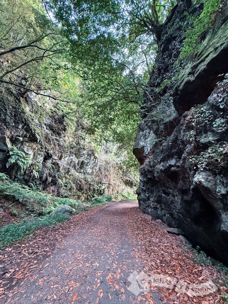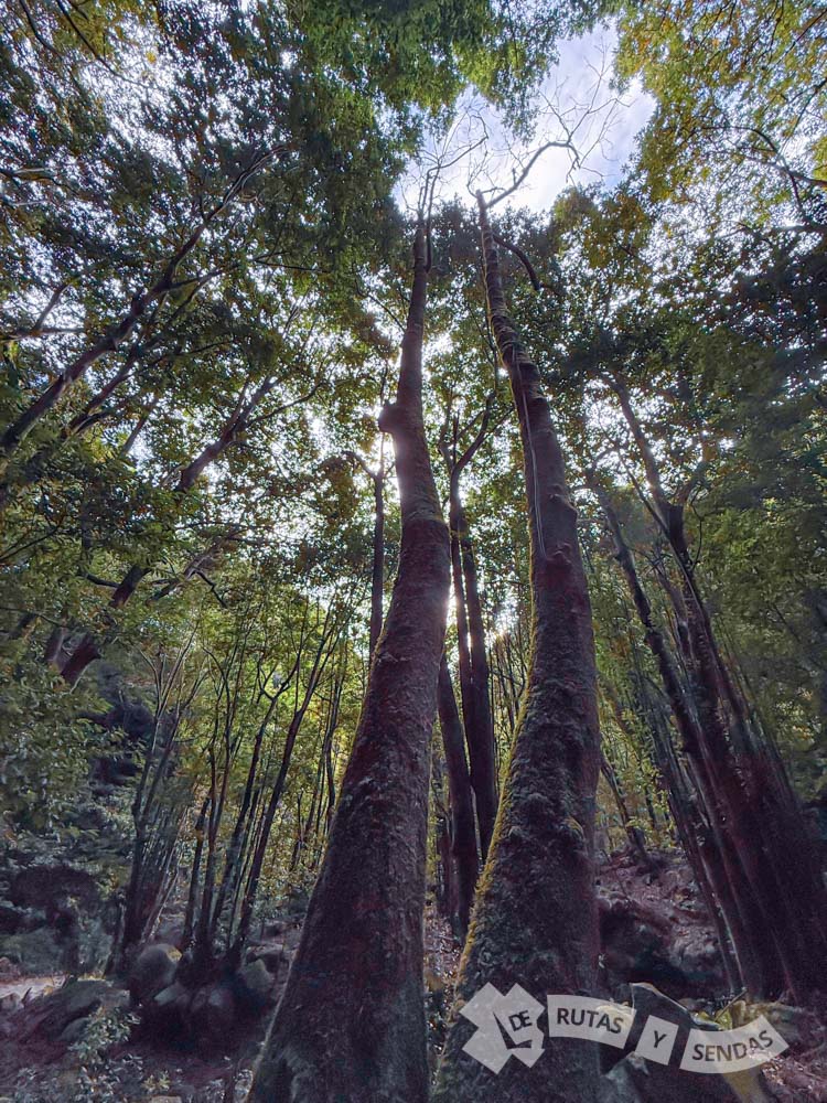 Un paraje donde las masas forestales no cejan en su empeño de ocuparlo todo, incluso hay especies se atreven a crecer en equilibrio por las paredes verticales de esta geología de origen volcánico.