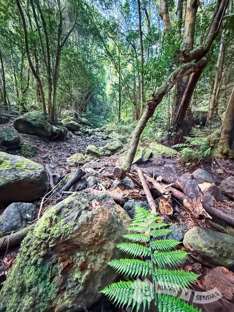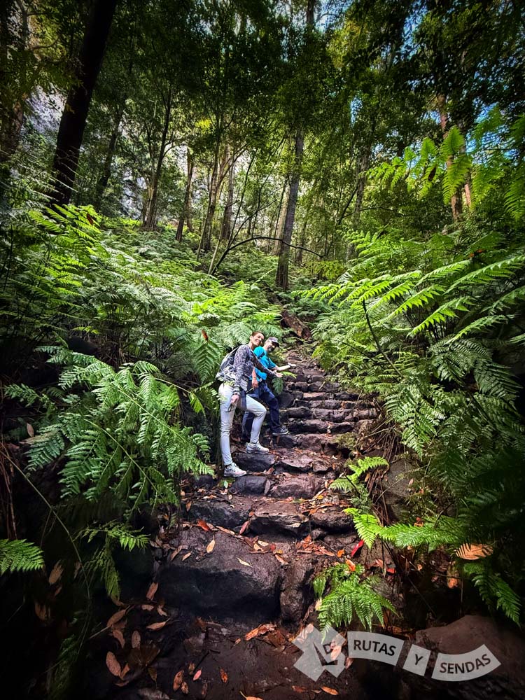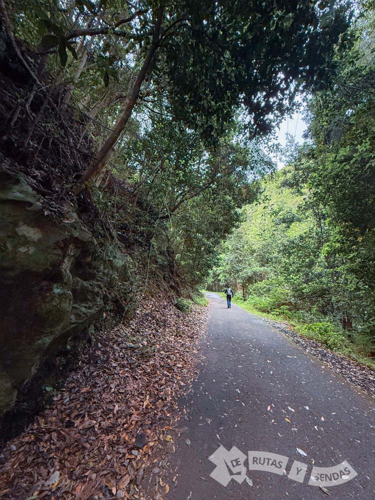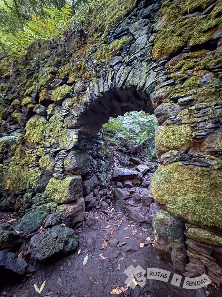 La senda se estrecha y se encajona por la vegetación. En la infraestructura de este canal la frondosidad apenas deja pasar la luz del sol. La humedad del lugar es más que evidente donde resaltan los enormes helechos y la presencia de musgos y líquenes forrando piedras y troncos.
