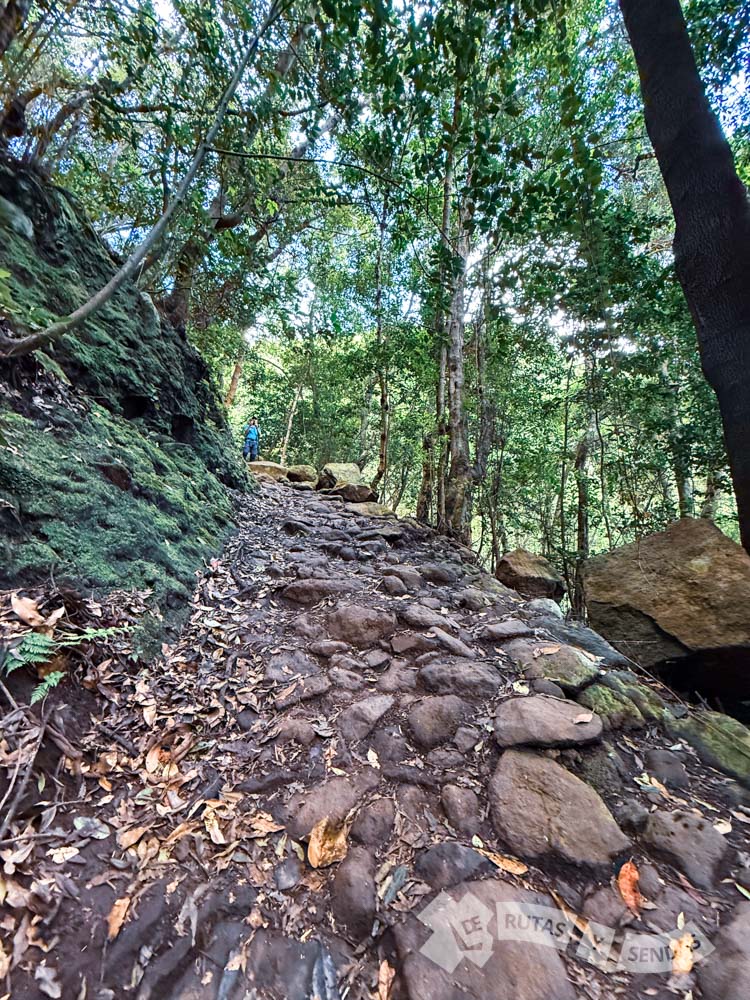 Esta es la parte más exigente de la ruta, donde el camino serpentea por un firme calzado de piedra empinado, con varias cuestas que superan el 20% de inclinación. Hay pendientes, en cambio, que también se ayudan de escalones de madera para facilitar poder superarlas.