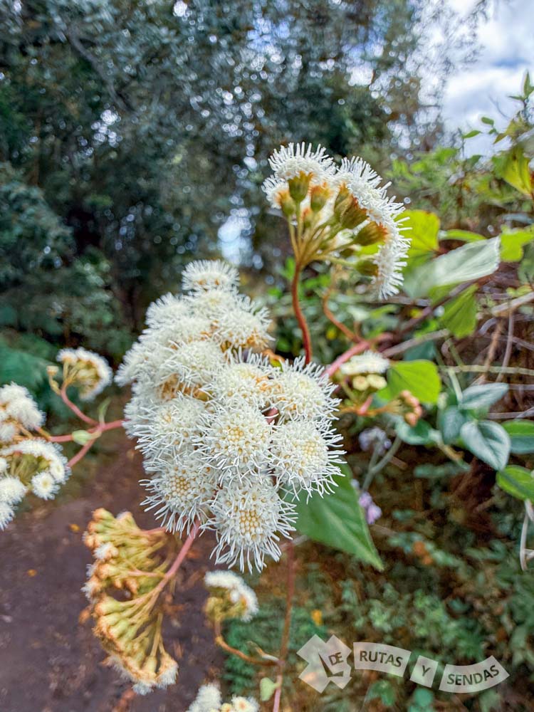 Mientras descendemos, observamos algunas especies de flora como el Chícharo de Flor y la Flor de Espuma, esta última considerada planta invasora debido a su rápida expansión que amenaza el crecimiento de la flora autóctona.