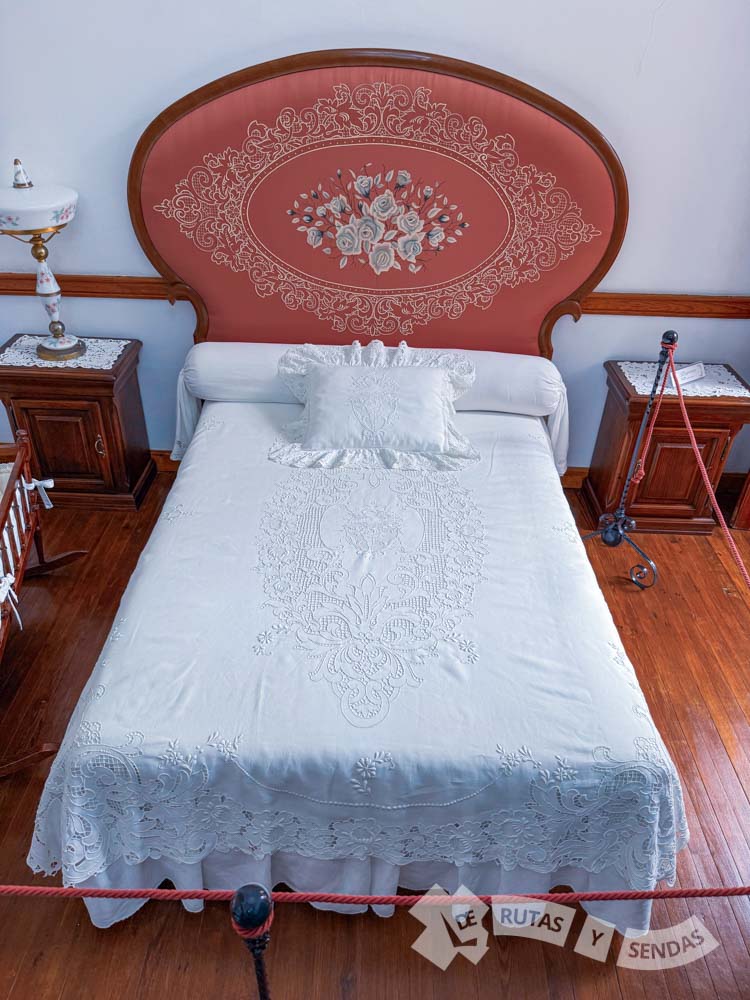 La cama que aquí se expone, se viste con un juego de cama de exquisito bordado. El cabecero, confeccionado en hilo de seda por dos artesanas de Villa de Mazo, parece un auténtico cuadro.