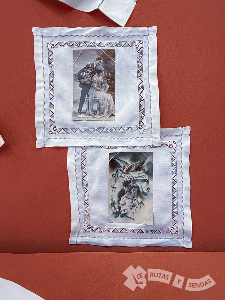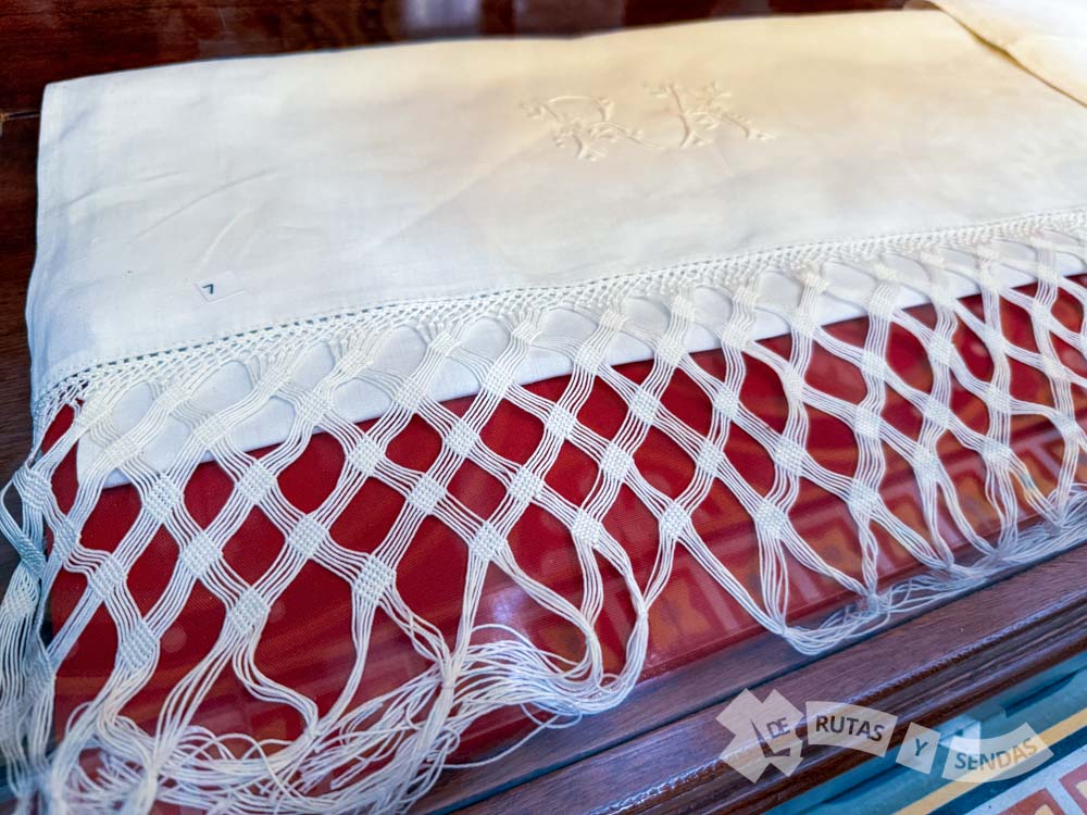 En las vitrinas contiguas se exponen piezas de mantelería, pañuelos -alguno de ellos perteneciente a la familia Pérez Díaz, blondas, encajes, fundas, camisones…Todo un muestrario de ajuar doméstico en el que podía advertirse el poder adquisitivo de una familia.