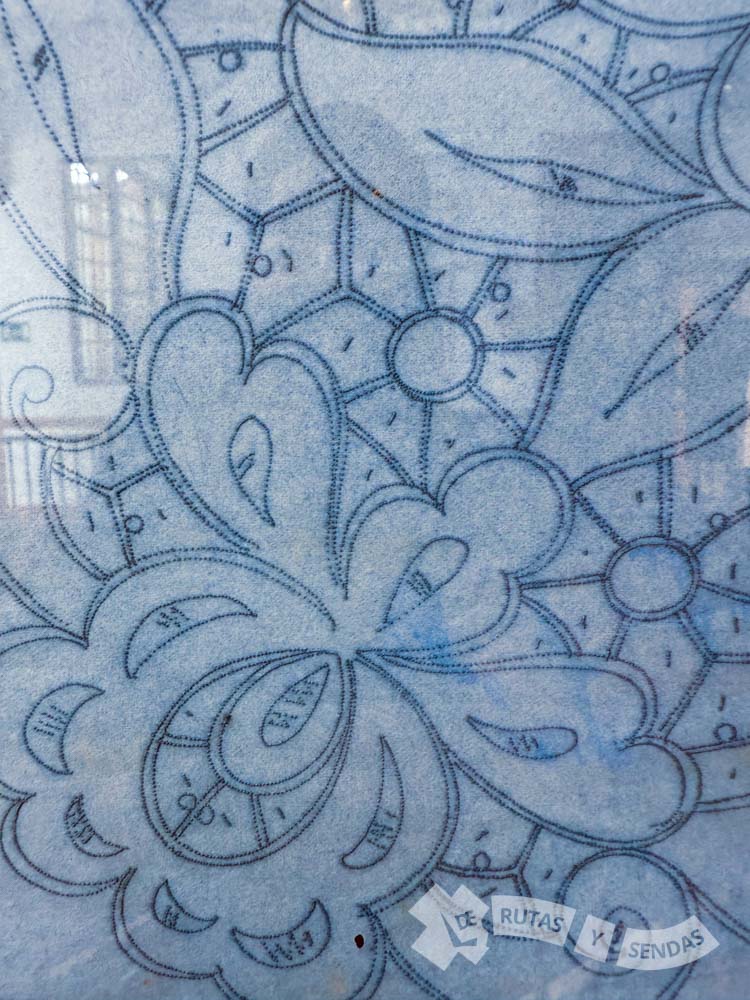Marlene, la guía del Museo, nos explica que sobre un papel cebolla o vegetal se dibuja el diseño. Luego se perforan sus contornos y se coloca el papel sobre la tela. Finalmente, con una solución de polvo azulado se frota el papel para que se transfiera el diseño sobre la tela a través de las perforaciones.