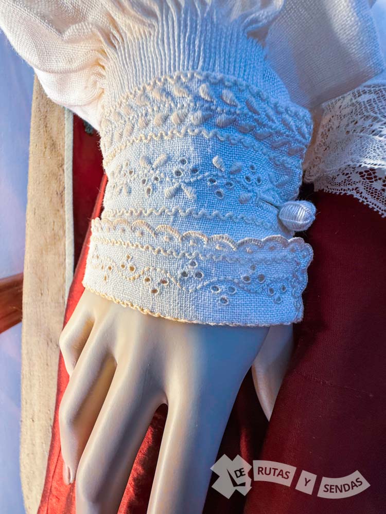 A continuación, Marlene nos enseña cómo el bordado de La Palma también se ha empleado en la confección de trajes tradicionales. En ellos también se aprecian las tres técnicas principales: