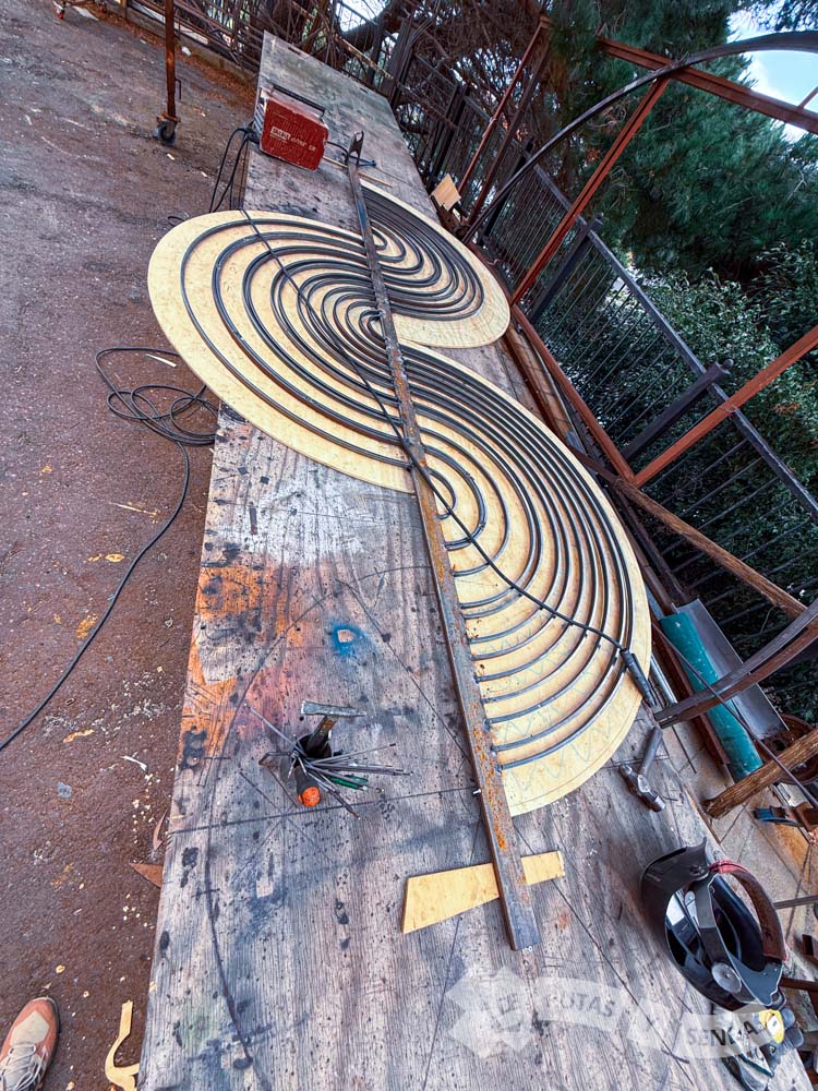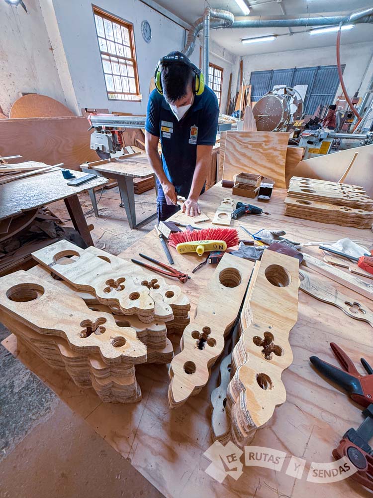Pedro, artesano de la madera nos enseña varios de los diseños de estos arcos y nos orienta a grandes rasgos sobre cómo hacen para darles vida. Los diseños iniciales se amplían en plotter a escala para luego calcarlos sobre las planchas de madera que terminarán definiendo las piezas de cada arco.