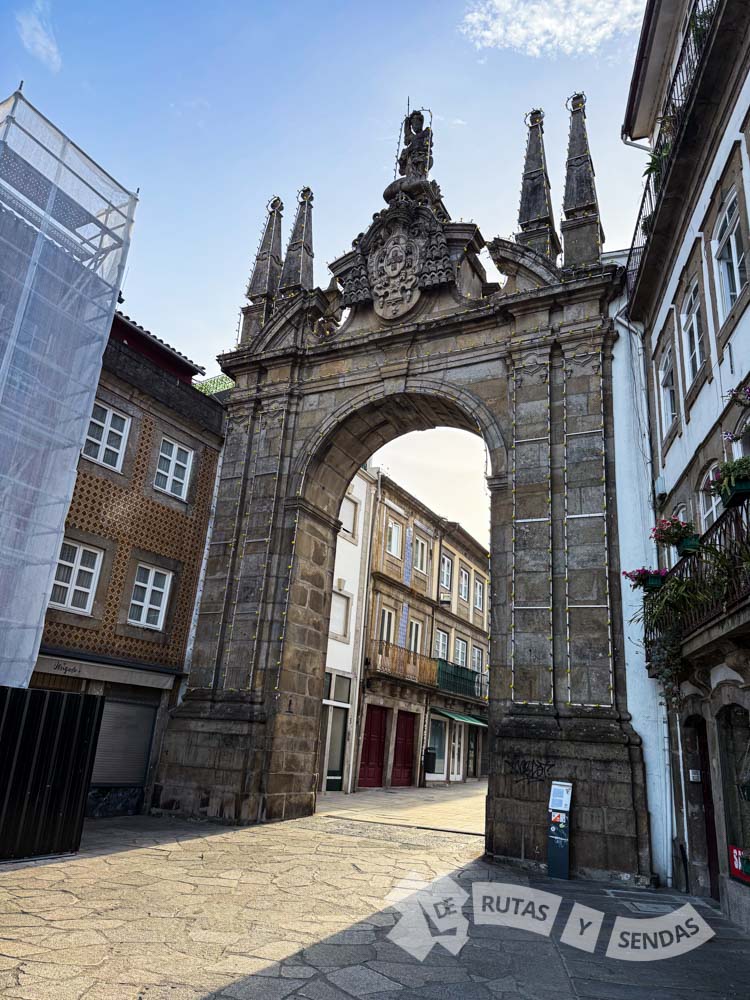 En principio, buscamos el Arco da Porta Nova, una de las puertas de entrada de la antigua muralla medieval. Como vemos lado interior se corona con una talla de Nuestra Señora de Nazaret.