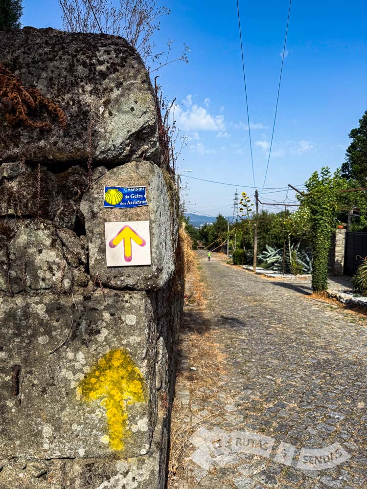 Desde luego, esta plaza es una buena manera de introducirnos en la peregrinación xacobea, y también algunas señales, aunque éstas que vemos pertenecientes al Caminho Minhoto Ribeiro no pertenecen al camino que debemos seguir.